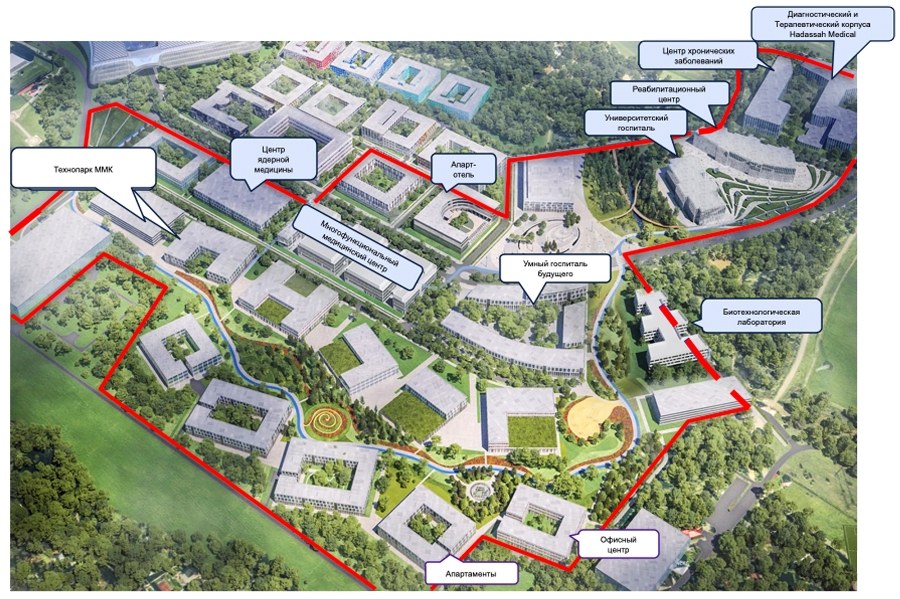 Международный медицинский кластер в Сколково: Терапевтический корпус с многофункциональным медцентром под управлением клиники «Хадасса» (Израиль) Центр французской медицины Университетского госпиталя Страсбурга: клинику реабилитации и дом престарелых