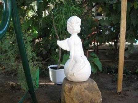 Если вам хочется сделать что-то посложнее грибочков, создайте скульптуру ангела. Это уже новый уровень ваяния, справившись с которым вы почувствуете себя настоящим скульптором. Естественно, если можете, то вылепите скульптуру без применения форм. Если же это не по вашим способностям задача, то сначала создайте голову ангела с помощью головы от старой куклы, а шар, на который вы его посадите, с помощью старого мяча. К пруту, выходящему из головы и входящему в круглую основу, прикрепите каркас для тела, на который будет нанесен гипс или бетон.