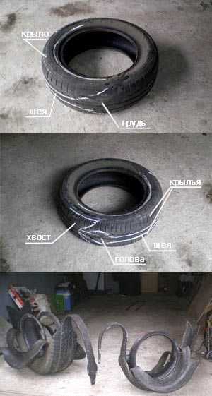 Популярно использование старых покрышек для создания садовых скульптур. Имея необходимый инструмент для резки резины (нож не подойдет), сделать своими руками подобное творение искусства не составит особого труда. Особой популярности приобрели лебеди из шин. На фото вы имеете возможность рассмотреть поочередность действий для их создания, так сказать мастер-класс в картинках.