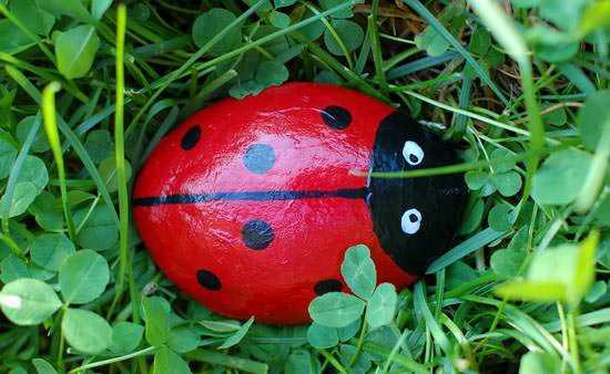 Все, что вам потребуется – валуны различных размеров и черная и красная краски. Валуны моются, сушатся, а затем остается только разрисовать их. Черным цветом рисуются точки на крыльях, глаза, красной – сами крылья. Если применить для создания глазок божьих коровок еще и белую краску, скульптуры получатся более выразительными.