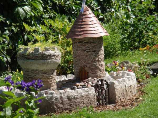 Заключительным этапом работ является украшение крыши конструкции битой плиткой. В качестве дополнительных украшений для скульптуры можно использовать созданную своими руками арку или заборчик.