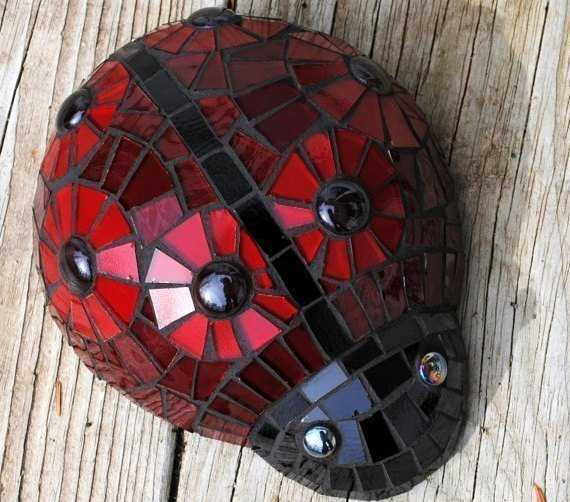 Оригинально и современно выглядят садовые скульптуры, украшенные мозаикой. Сделать божьих коровок в таком стиле несложно.