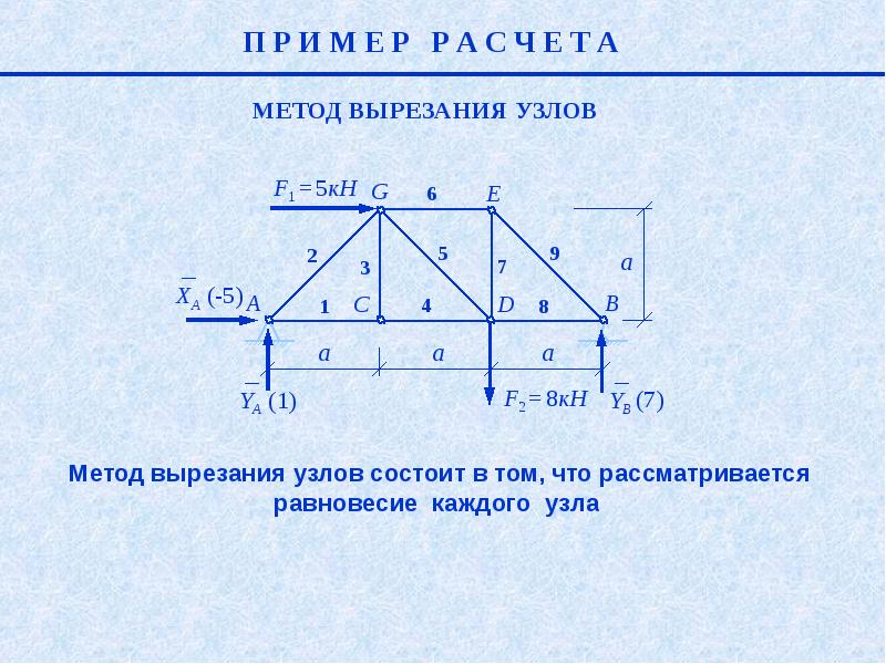 в) Способ вырезания узлов. Применяется, когда два предыдущих способа не неприменимы, т.е. нельзя провести сечение через три стержня. Данный способ заключается в вырезании узла, к которому принадлежит искомый стержень и рассмотрении равновесия этого узла.