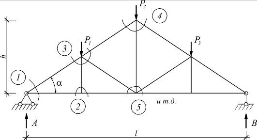 Выполнить расчет фермы, это значит, что в первую очередь нужно определить усилия в стержнях фермы. Общепринятые обозначения усилий в стержнях фермы: