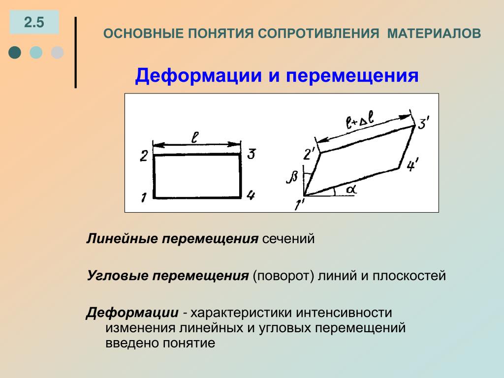 Сопротивление материалов оперирует такими понятиями как: внутренние усилия, напряжения, деформации. Приложенная внешняя нагрузка к некоторому телу порождает внутренние усилия в нём, противодействующие активному действию внешней нагрузки. Внутренние усилия, распределенные по сечениям тела называются напряжениями. Таким образом, внешняя нагрузка порождает внутреннюю реакцию материала, характеризующуюся напряжениями,которые в свою очередь прямо пропорциональны деформациям тела. Деформации бывают линейные такие как удлинение,укорочение, сдвиг и углы поворота сечений. Основные понятия сопротивления материалов оценивающие способность материала сопротивляться внешним воздействиям являются: