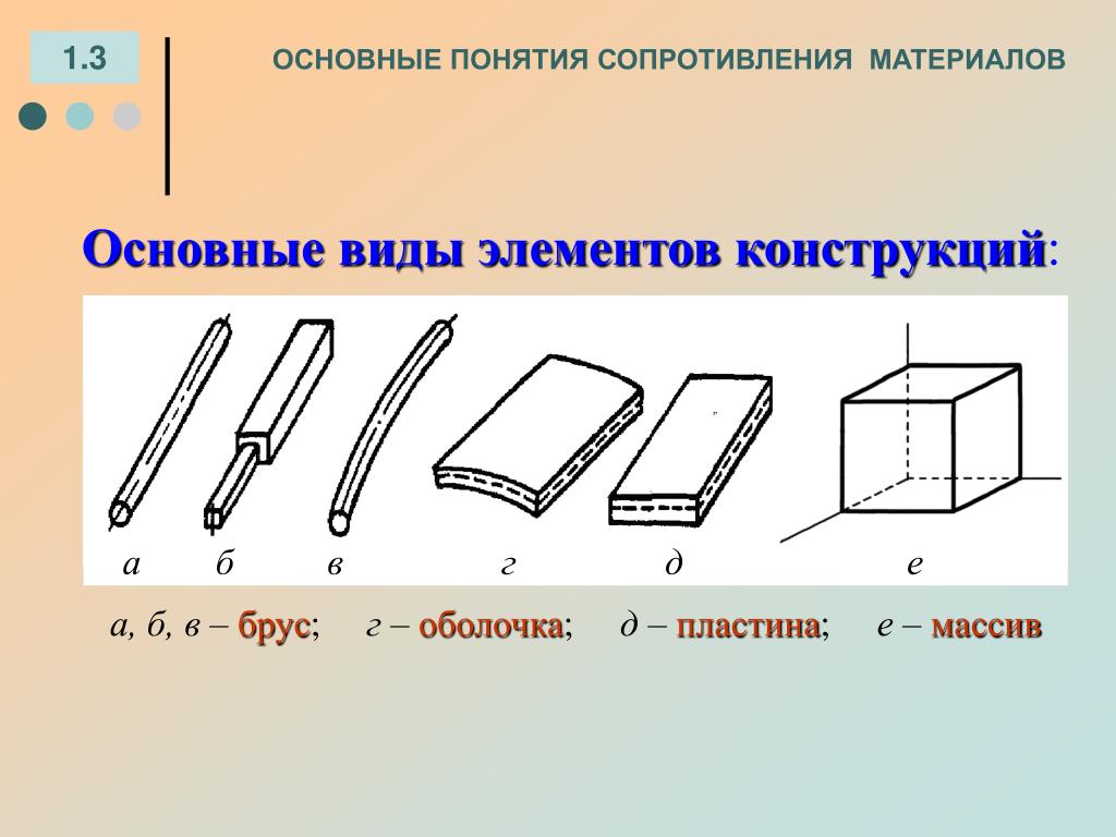 Сопротивление материалов базируется на понятии «прочность», что является способностью материала противостоять приложенным нагрузкам и воздействиям без разрушения. Сопротивление материалов оперирует такими понятиями как: внутренние усилия, напряжения, деформации. Приложенная внешняя нагрузка к некоторому телу порождает внутренние усилия в нём, противодействующие активному действию внешней нагрузки. Внутренние усилия, распределенные по сечениям тела называются напряжениями. Таким образом, внешняя нагрузка порождает внутреннюю реакцию материала, характеризующуюся напряжениями,которые в свою очередь прямо пропорциональны деформациям тела. Деформации бывают линейные такие как удлинение,укорочение, сдвиг и углы поворота сечений. Основные понятия сопротивления материалов оценивающие способность материала сопротивляться внешним воздействиям являются: