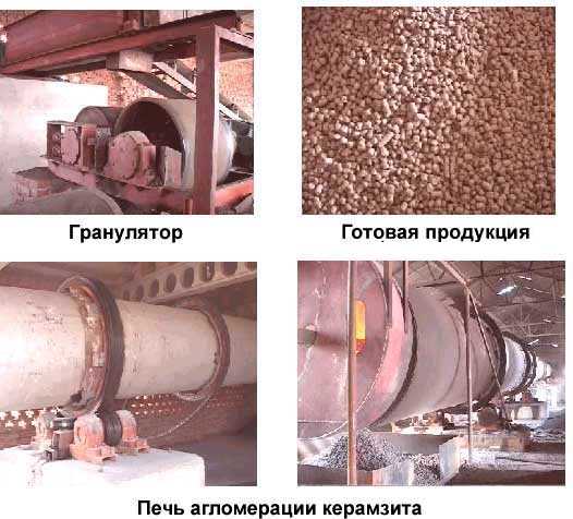 Гранулы производятся путем обжига глины в металлических печах в виде барабанов, диаметр которых 2-5 м, а длина достигает 70 м. Печи устанавливают под заранее выбранным углом и засыпают в них керамзитовый полуфабрикат. Под барабанами установлены форсунки для сжигания топлива и нагрева нижней части печей. Во время вращения цилиндров гранулы перемешиваются и скатываются вниз.