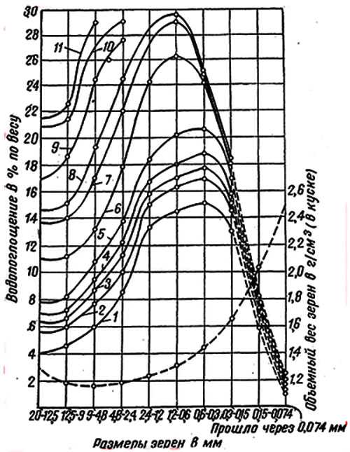 При прочих равных условиях чем зерно керамзита больше, тем меньше объемный вес его в куске.