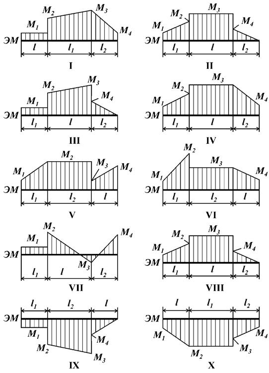 - Одна из двух эпюр моментов на этом участке (грузовая или единичная) должна быть обязательно линейной. При этом обе эпюры не должны в пределах данного участка иметь перелома.