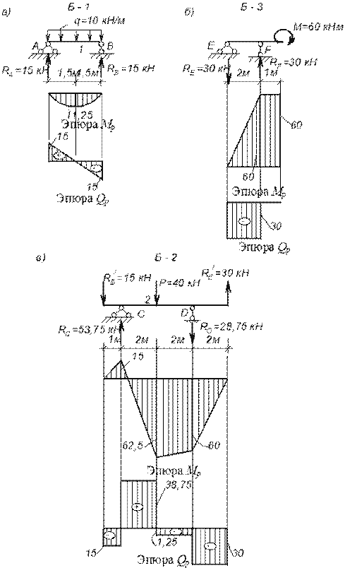 Строим эпюры от заданной нагрузки и от единичных моментов, приложенных в сечениях А и В (см. рис.). Искомые перемещения определяем с помощью интегралов Мора
