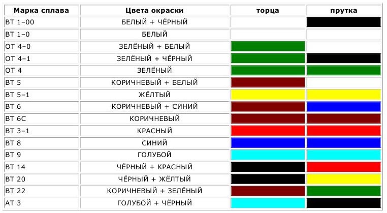 Первые цифры марки обозначают среднее содержание углерода в стали (в сотых долях процента для конструкционных сталей и в десятых долях процента для инструментальных и нержавеющих сталей). Сталь обыкновенного качества Ст0; ВСт0, БСт0 — Красный и зеленый Ст1, ВСт1кп — Желтый и черный Ст2, ВСт2кп — Желтый СтЗ, ВСтЗкп, ВСтЗ, БСтЗкп, БСтЗ — Красный Ст4, ВСт4кп, ВСт4, БСт4кп, БСт4 — Черный Ст5, ВСт5 — Зеленый Ст6 — Синий Углеродистая качественная сталь 08, 10, 15, 20 — Белый 25, 30, 35, 40 — Белый и желтый 45, 50, 55, 60 — Белый и коричневый Легированная конструкционная сталь Хромистая — Зеленый и желтый Хромомолибденовая — Зеленый и фиолетовый Xромованадиевая — Зеленый и черный Марганцовистая — Коричневый и синий Хромомарганцовая — Синий и черный Хромокремнистая — Синий и красный Хромокремнемарганцовая — Красный и фиолетовый Никельмолибденовая — Желтый и фиолетовый Хромоникелевая — Желтый и черный Хромоникелемолибденовая — Фиолетовый и черный Хромоалюминиевая — Алюминиевый Коррозионностойкая сталь Хромистая — Алюминиевый и черный Хромоникелевая — Алюминиевый и красный Хромотитановая — Алюминиевый и желтый Хромоникелекремнистая — Алюминиевый и зеленый Хромоникелетитановая — Алюминиевый и синий Хромоникелениобиевая — Алюминиевый и белый Хромомарганценикелевая — Алюминиевый и коричневый Хромоникелемолибденотитановая — Алюминиевый и фиолетовый Быстрорежущая сталь Р18 — Бронзовый и красный Р9 — Бронзовый Твердые спеченные сплавы ВК2 — Черный с белой полосой ВКЗ-М — Черный с оранжевой полосой ВК4 — Оранжевый ВК6 — Синий ВК6-М — Синий с белой полосой ВК6-В — Фиолетовый ВК8 — Красный ВК8-В — Красный с синей полосой ВК10 — Красный с белой полосой ВК15 — Белый Т15К6 — Зеленый Т30К4 — Голубой | ||||||||||||||||||||||||||||||||||||||||||||||||||||||||||||||||||||||||||||||||||||||||||||||||||||||||||||||||||||||||||||||||||||||||||||||||||||||||||||||||||||||||||||||||||||||||||