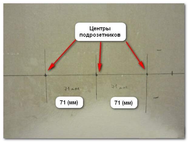 В соответствии с размерами подрозетника выбираются бур и коронка для сверления отверстий. Подбирать инструмент под диаметр отверстия нужно внимательно, иначе коробка просто не поместится внутрь. Железобетон и другие материалы повышенной прочности сверлятся алмазными коронками, а расстояние между подрозетниками в 71 мм сохраняется независимо от их размеров.