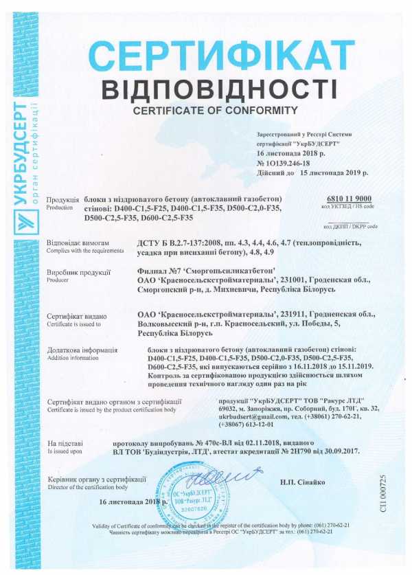 Сертификат подтверждающий, что производимые нашим предприятием блоки из ячеистого бетона (автоклавный газобетон) стеновые соответствуют требованиям технических нормативных документов Украины.