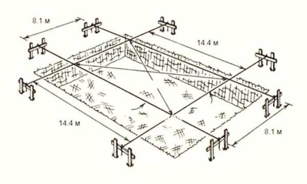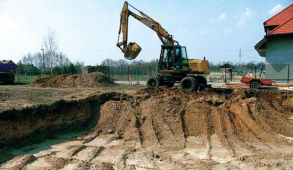 Обычно фундамент сооружается ниже уровня промерзания грунта. Сначала на земле намечаются контуры будущей постройки. Затем происходит выемка грунта с помощью экскаватора. Дно получившегося котлована вычищается и утрамбовывается вручную.