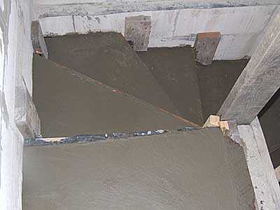 Простая деревянная лестницаВдоль наружной поверхности этой стены устанавливается лестничный марш, опирающийся на одной стороной на неё, а другой — на дополнительный простенок. Ступени лестницы можно отлить из бетона и армировать его сеткой из стального проката или изготовить из металлического профиля. Использование древесины нежелательно из-за большой вероятности повреждения грибками или иными вредителями.