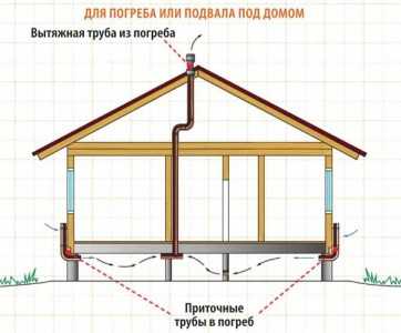 Для организации качественного воздухообмена необходимо установить две вертикальные трубы. Одна из них служит вытяжкой, а другая необходима для притока свежего воздуха. Отбор воздуха производится из-под потолка, а подача — ближе к полу. В целях создания максимальной тяги воздуховод следует установить выше конька крыши. Естественная вентиляция погреба изготавливается с минимальными затратами и вложениями.