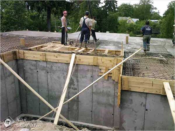 - Пришло время заливки опалубки. Процесс заливки бетона должен быть непрерывным. Получившаяся плита должна иметь толщину двадцать – двадцать пять сантиметров.