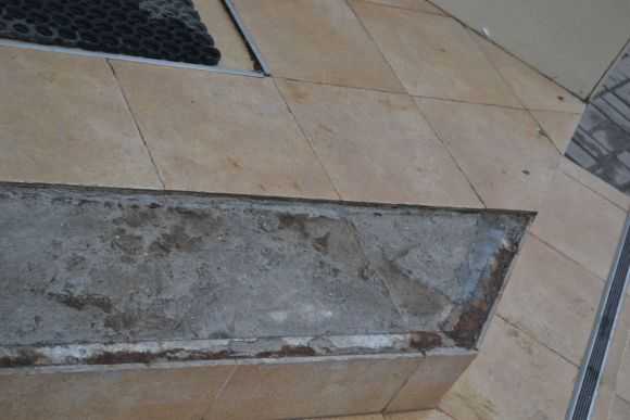 Установленные декоративные уголки или профили, при температурных колебаниях создают трещины в затирке. Об этом подробнее здесь. В трещины поступает вода. Особенно опасно таяние на пороге снега. Днем он тает , медленно просачиваясь в микротрещины, а ночью замерзает, раскрывая их сильнее.