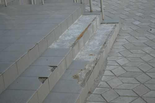 При создании этого крыльца, наверное, была поставлена задача, создать постоянный источник дохода для строителей. Потому как его периодически, раз в три – четыре года, ремонтируют. Мало того, что конструкция состоит из отдельных подвижных элементов – наборных ступеней; промежутки заполнены, вдобавок, кирпичом. При температурных колебаниях все части расширяются отдельно, приводя к трещинам в швах, затеканию воды и подрыве плитки.