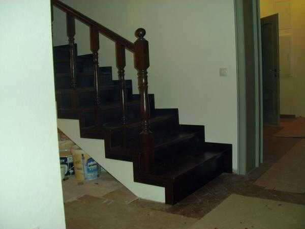 Несколько слов о выборе дерева. Универсального совета, какую древесину лучше использовать, не существует: с помощью пропитки морилкой относительно дешевую сосну можно превратить в красное дерево или ливанский кедр. Главное, чтобы поры дерева были надежно закупорены специальным лаком или краской, обеспечивающим защиту от разрушения, проникновения спор плесени и гниения. Если не выполнить данное условие, то нет смысла применять для отделки лестницы из бетона очень дорогой дуб или ясень, плохо просушенные, не обработанные, подверженные воздействию внешней среды.
