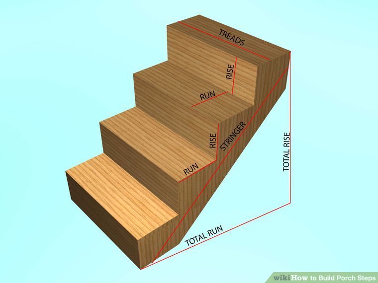 Подъем — это высота крыльца или ступенек, которые вам понадобятся. Пробег – это общая длина ступеней от края крыльца до места, где заканчиваются ступени. Стрингеры обычно представляют собой обработанные деревянные доски размером 2 x 12 дюймов (5,1 x 30,5 см), к которым крепятся ступени и подступенки. Вы можете купить предварительно обрезанные стрингеры в большинстве магазинов пиломатериалов или товаров для дома.