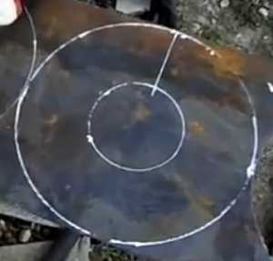 - на листовом металле рисуем круг диаметром 300мм (наружный диаметр лопасти), а внутри него еще один круг диаметром нашей трубы (108мм).