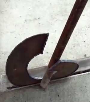 Вырезаем резаком заготовку и разрезаем полосу как показано на фото. Чтобы получилась лопасть, заготовку нужно разогнуть сантиметров на 15. Для этого нужны мощные тиски или, к примеру, щель между бетонными блоками или плитами. Фиксируем заготовку разрезом вверх, и разгибаем в разные стороны с помощью рычага — лома или обрезка трубы.
