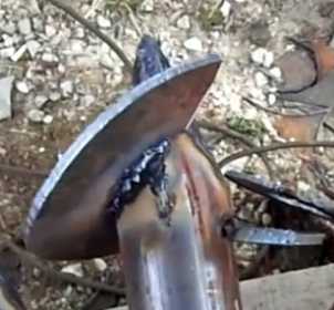 - на заостренную трубу одеваем лопасть и привариваем всплошную с двух сторон, так как сварному шву предстоит нести значительную нагрузку.
