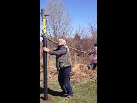 Первую сваю ввинчивать проще всего. Во время работы достаточно контролировать вертикальный уровень сваи (для этого лучше всего использовать магнитный уровень). Если вы работаете втроем, то один человек с помощью уровня контролирует положение сваи в пространстве, а два других – ввинчивают опору в землю.