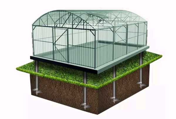 Важно! Конструкцию парника устанавливают на сваи, которые имеют два захвата, один из которых цепляется в грунт как якорь, а второй предназначен для поддерживания нижнего основания теплицы.