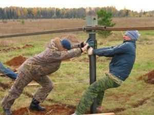 - Два человека берутся за рычаги и выполняют закручивание свай вручную. Третий удерживает в вертикальном положении и контролирует после каждого оборота, чтобы опора погружалась строго по вертикальному уровню.