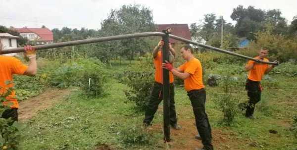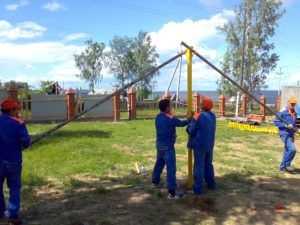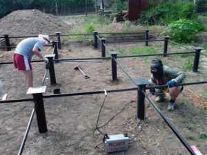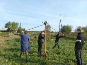 Сваи ввинчиваются с помощью рычагов, в нашем случае это обычный лом. Когда закручивание становится тугим рычаги удлиняются дополнительными трубами. Этот процесс должен проходить равномерно и по команде, чтобы не сместить опору.