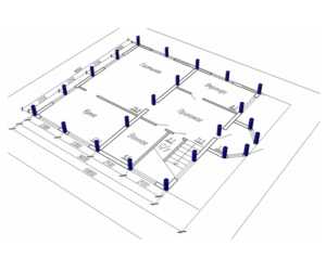 План дома делят на прямоугольники, рассчитывают размер каждого участка. На каждом углу прямоугольника и по центру всех несущих конструкций размещают сваю.