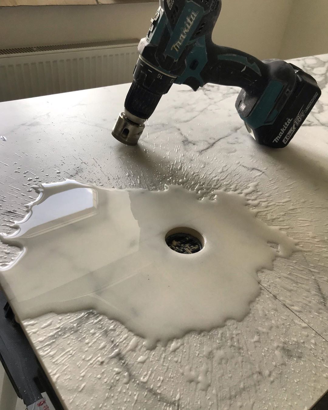 Это позволит в дальнейшем найти удобный упор инструментом, чтобы он не соскальзывал. Прижимать дрель нужно умеренно, не прилагая значительных усилий, иначе есть риск сломать сверло.