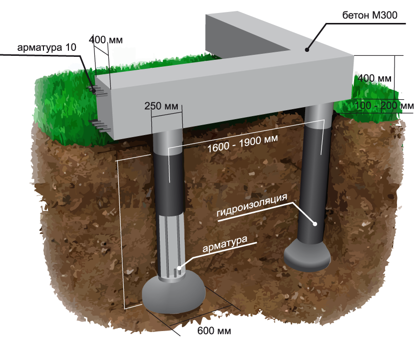 При реализации этого фундамента берутся столбы, рассчитывается их размер и число, отдаленность. Это зависит от веса строения, несущей способности грунта и другого. Обязателен также расчет глубины замерзания грунта (в каждом регионе свои данные), глубины поверхностных вод и так далее.