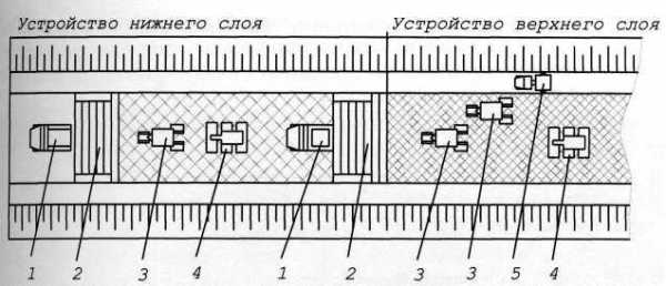 1 — автомобиль-самосвал; 2 — асфальтоукладчик; 3 — каток на пневматических шинах; 4 — каток тяжелый гладковалъцовый массой 11-18 т; 5 — поливочно-моечная машина