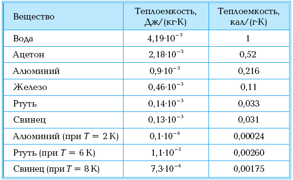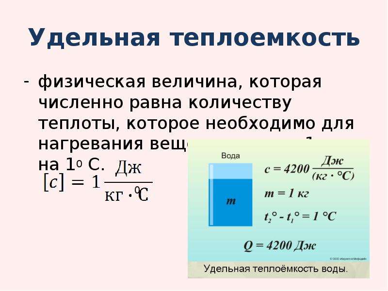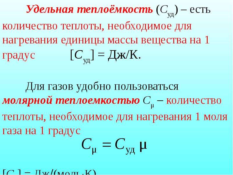 Если отнять тепло, то его температура уменьшится. Если объект имеет большую массу, потребуется больше тепла, чтобы поднять его температуру на ту же величину, чем объект с меньшей массой. Эти утверждения можно обобщить математически, используя новую физическую константу, удельную теплоемкость :