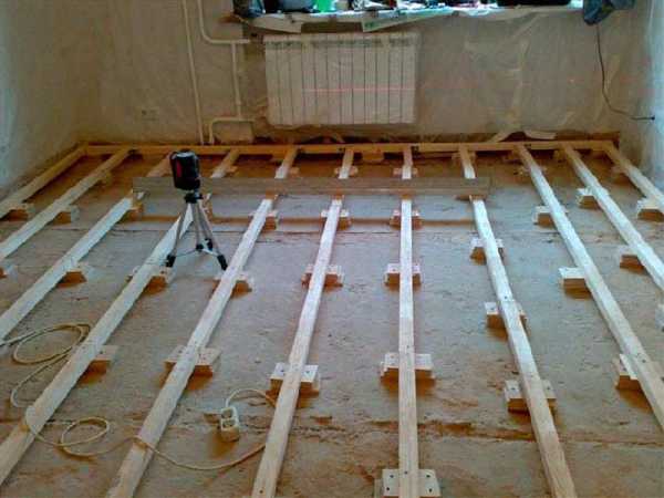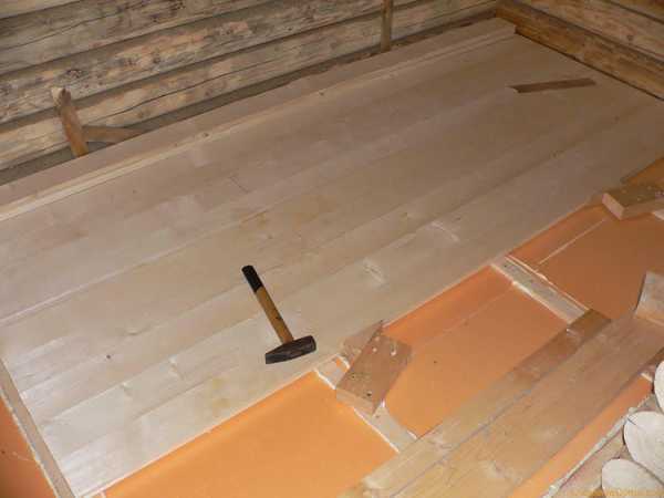 Обустраивать такой пол следует с укладки гидроизоляции. На поверхность пола укладывается полиэтиленовая пленка для предохранения утеплителя от влаги. Потом соблюдая интервал, устанавливают лаги, образовавшиеся между ними пустоты, наполняются материалом для теплоизоляции. Сверху сделанной конструкции прибивают половые доски, также можно воспользоваться фанерными листами или ДСП. У стен нужно оставлять зазор примерно 16- 20 мм.