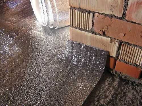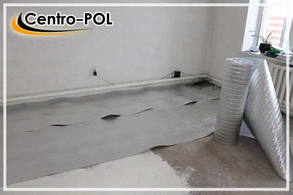 - Поверх пенополистирола настилается гидроизоляционная пленка с заворотом на стены минимум на 20 см. Гидроизоляция не допускает попадание в помещение влажности, при возможном выпадании росы на холодном перекрытии.