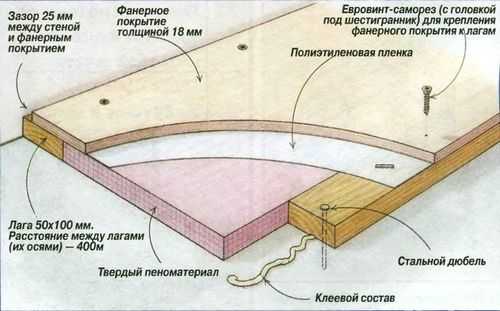 Иногда, перед финишной облицовкой, производят дополнительную укладку фанеры или листов ДСП. Это позволяется создать абсолютно ровную поверхность и выполнит укладку шумо- и теплоизоляционной подложки.