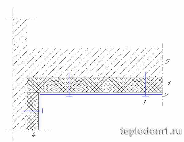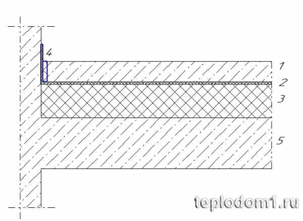 1 — армированная бетонная стяжка, 2 — гидроизоляция с напуском на стены, 3 — утеплитель экструдированный пенополистирол, 4 — шов вдоль стены заполненный пенополистиролом , 5 — бетонное основание.