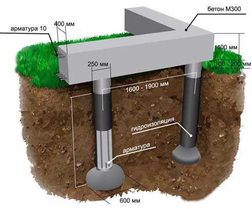 Именно это расширение позволяет фундаменту во-первых нести гораздо более серьезные нагрузки (ведь площадь основания каждого столба значительно увеличивается), а во-вторых такую конструкцию бетонного столба не смогут выдавливать поперечные силы морозного пучения.