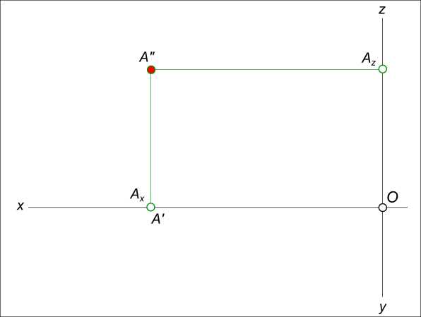 Таким образом, для построения эпюра точки А(x, y, z) нужно от начала координат по оси х12 отложить координату х точки А, затем провести вертикальную линию связи, на которой от оси х12 отложить координату y вниз (если она положительна), а координату z вверх (положительное значение).