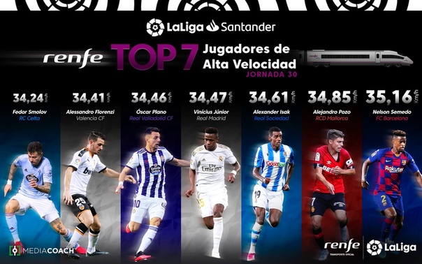 10 — 10.Кай Хаверц («Челси») – 35,02 км/ч9 – 9. Лерой Сане («Бавария»): 35,08 км/ч8 – 8. Адама Траоре («Вулвз») – 35,32 км/ч7 – 7. Пьер Эмерик Обамеянг («Арсенал») – 35,50 км/ч6 – 6. Кайл Уокер («Манчестер Сити») – 35,71 км/ч5 – 5. Килиан Мбаппе (ПСЖ) – 36 км/ч5 – 4. Эрлинг Хааланд (Боруссия Д) – 36,04 км/ч4 – 3. Ромелу Лукаку (Челси) – 36,25 км/ч3 – 2. Ашраф Хакими («Интер») — 36,48 км/ч2 — 1. Альфонсо Дэвис («Бавария»): 36,51 км/ч