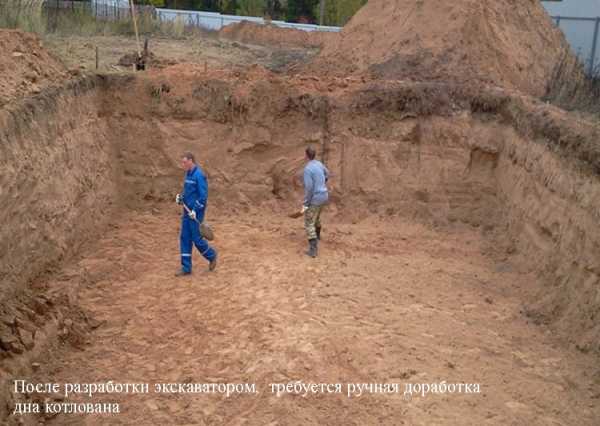 Не докопанный до нужной отметки экскаватором грунт просто снимается своими руками, а вот в случае перекопа требуется устройство искусственного основания (подушки).