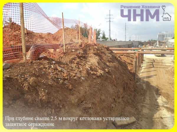 Выкопанные котлованы и траншеи должны быть ограждены сигнальной лентой, а при глубине свыше 2,5 м защитным ограждением. Спуск в котлован оборудуется надежной лестницей.