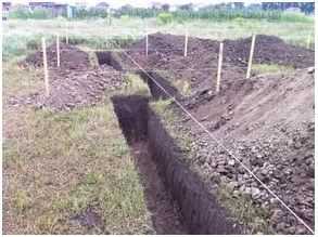 Перед тем как выкопать траншею под фундамент нужно разметить ее границы в соответствии с данными и параметрами, перенесенным с плана, на участке вбивают колышки и натягивают шнурку, строго следя за созданием прямых углов.