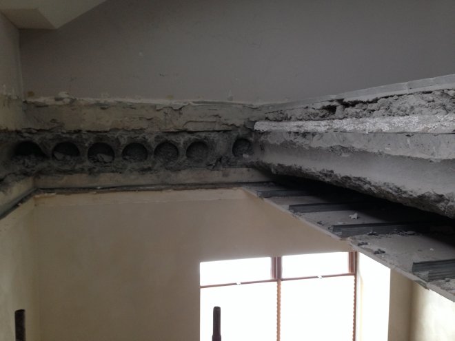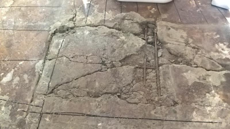 Для выполнения такой работы необходимо снять всю домашнюю мебель, напольные покрытия и внутренние стены. Затем бригада разбивает существующий пол на мелкие кусочки и убирает их вручную.