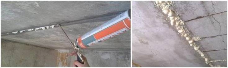 Обычный раствор такого не позволит. При помощи строительного пистолета герметик нужно заложить в шов плиты перекрытия, излишки убрать резиновым либо металлическим шпателем.