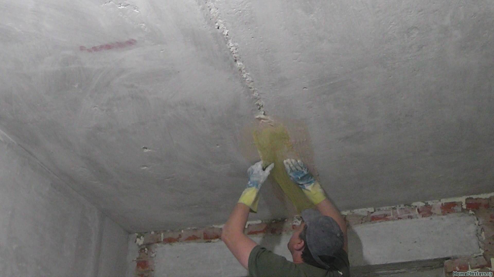 Щель нужно расширить шпателем, должно получиться V-образное углубление. Трещина перекрытия очищается от пыли. После чего на потолок следует нанести специальную грунтовку, для удобства можно использовать валик или щетку. Грунтовать поверхность нужно очень тщательно, не забывая о швах и трещинах. Дать грунтовке высохнуть.
